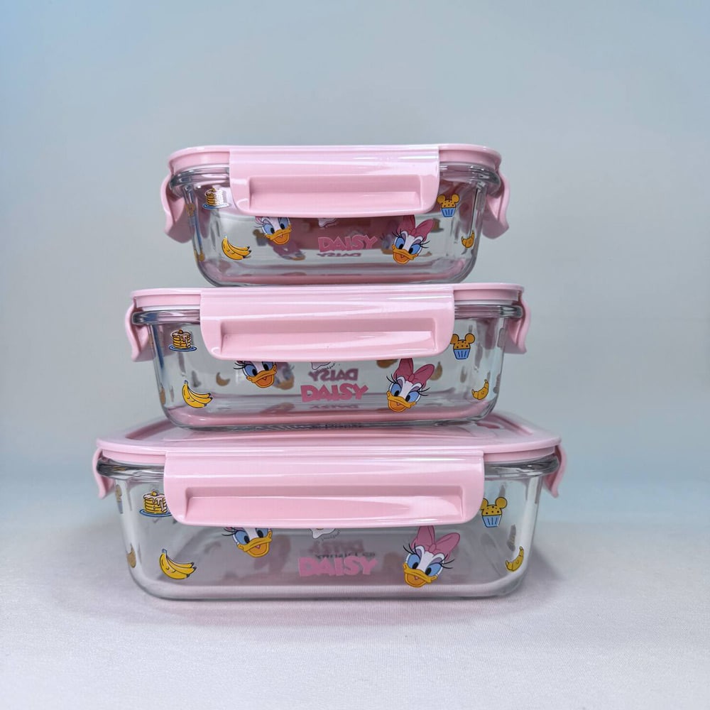 ظروف در دار پیرکس دیزنی لند، با طرح دیزی، در بسته‌های سه عددی در فروشگاه آنلاین شاتوت لند موجود و قابل سفارش است. ارتفاع هر ۳ ظرف شش سانتی متر و طول آنها ۱۵، ۱۷ و ۲۰ سانتی متر است. پیرکس بودن این ظروف کار شما را از بعضی جهات راحت میکند؛ به طور مثال میتوانید غذای خود را در خود ظرف در ماکروفر گرم کنید و در همان طرف سرو و یا درب آن را بسته و جابجا کنید.