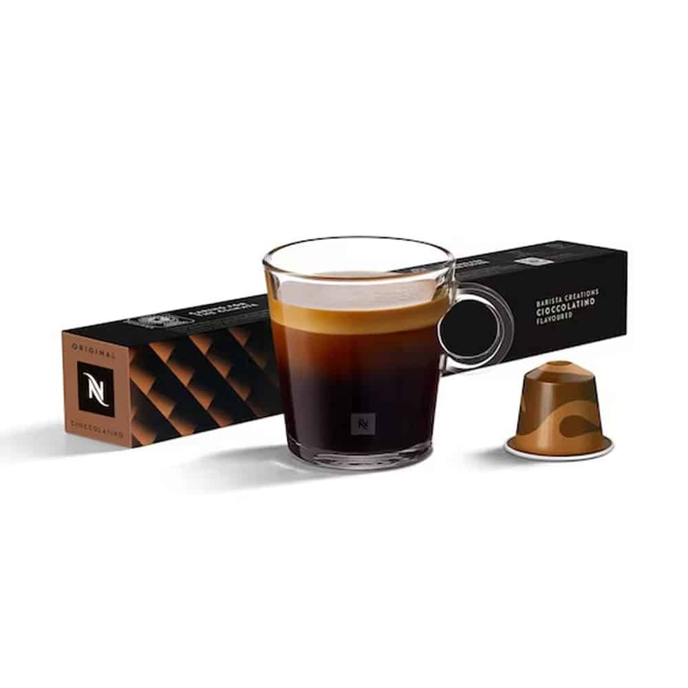 کپسول قهوه نسپرسو باریستا کریئیشن شکلاتینو (Nespresso Barista Creations Cioccolato) یک قهوه طعمدار و شیرین است با ترکیب قهوهای غنی از دانه های عربیکای آمریکای لاتین و طعم دلپذیر شکلات. این قهوه دارای نتهای شیرین و غنی از شکلات است که با شیرینترین اسپرسوها یا نوشیدنیهای مبتنی بر شیر بسیار هماهنگ است. شدت آن معمولاً 6 از 13 است، مناسب کسانی که به دنبال قهوهای با طعم شکلاتی ملایم و قوامدار هستند. این نوشیدنی برای لاته یا کاپوچینو شکلاتی یک گزینه عالی است.